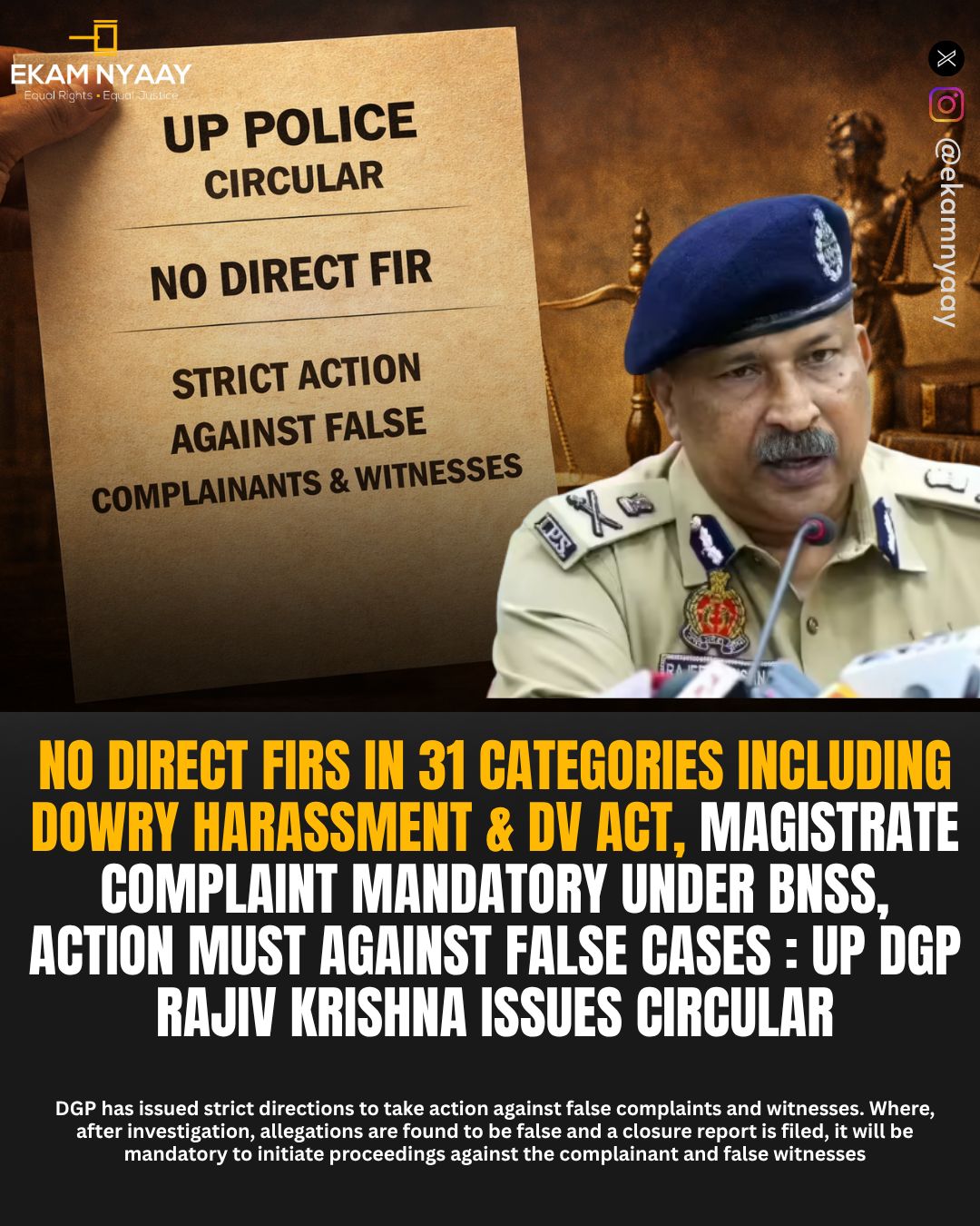 DGP (Uttar Pradesh) Rajiv Krishna, has issued a circular restricting the direct registration of FIRs in 31 categories of cases, including dowry harassment and cheque bounce matters. Following the strong remarks by Allahabad High Court in Aniruddh Tiwari v. State of UP, where Court objected to the registration of an FIR under Section 82 BNS, stating that such action violated procedural requirements. Court clarified that under Section 219 of BNSS, courts cannot take cognizance of offences u/s 81 to 84 of BNS unless a complaint is filed directly by the aggrieved person to the magistrate. It emphasized that in such complaint-based offences, initiation must be through a private complaint before a magistrate, and not through police FIRs, rendering such FIRs legally unsustainable. Acting on these remarks, DGP directed all police officials that FIRs must not be registered where the law requires direct recourse to the court, and individuals must first approach a magistrate. Police officers, including SHOs and IOs, have been instructed to carefully scrutinize complaints to determine whether a police report is legally maintainable before registering an FIR. In addition, DGP has issued strict directions to take action against false complaints and witnesses. Where, after investigation, allegations are found to be false and a closure report is filed, it will be mandatory to initiate proceedings against the complainant and false witnesses. Such action will be taken under Sections 212 and 217 of BNS (earlier Sections 177 and 182 IPC), which penalize furnishing false information. While these provisions already existed in law, DGP has now directed their strict and mandatory enforcement.