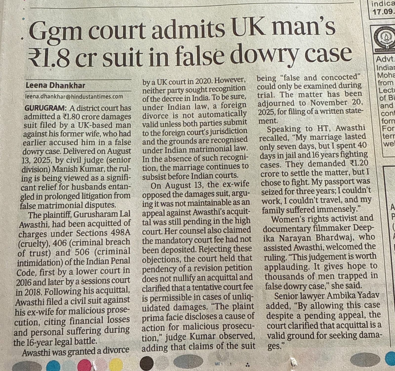 Gurgaon Court admits UK Man’s 1.8 Crore Suit in False Dowry Case