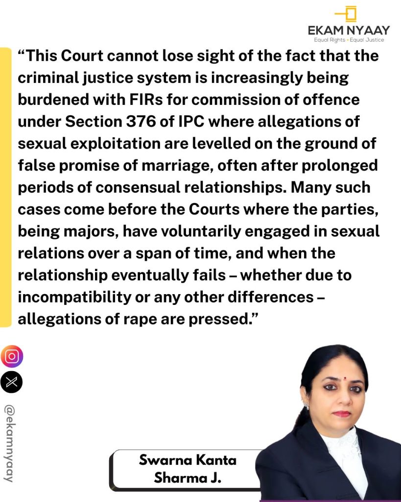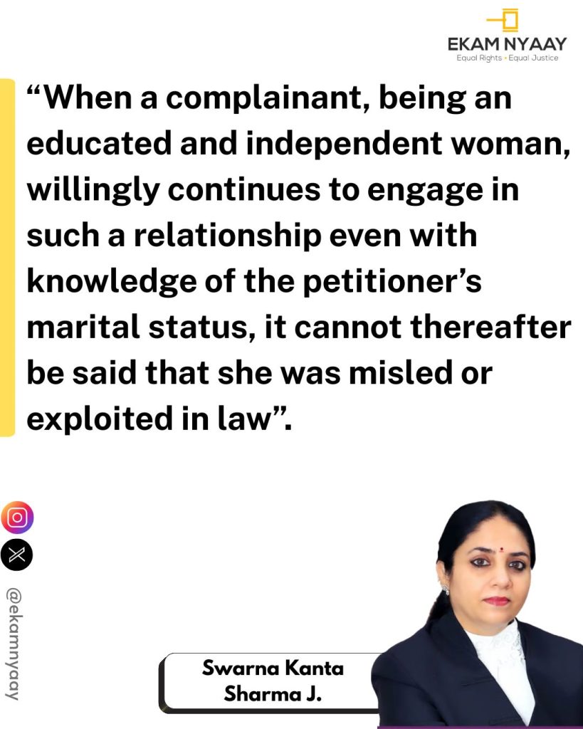 Court examined the factual matrix and noted, “once the formal proposal of marriage between the families had failed due to the demand of dowry, the complainant and the petitioner had nonetheless continued to meet each other… and had voluntarily entered into a relationship, including a physical one”. Importantly, even after knowing that Ankit Raj had contracted another marriage, the complainant “continued to accompany him and maintained sexual relations with him”.