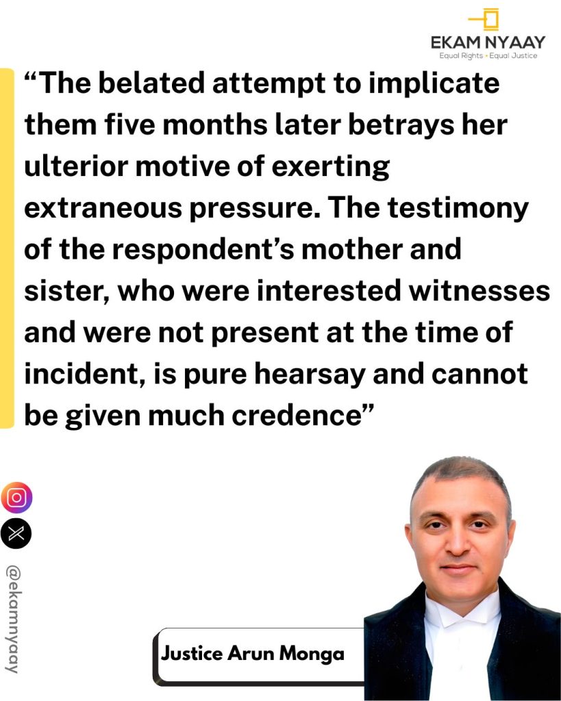 The wife’s case was that the relatives travelled all the way from U.P. to Delhi to “arm twist” her, assaulting her and causing minor injuries. She produced three witnesses her mother, father, and sister to support her claims. However, Court noted that they were not present during the alleged incident and their depositions amounted to hearsay.