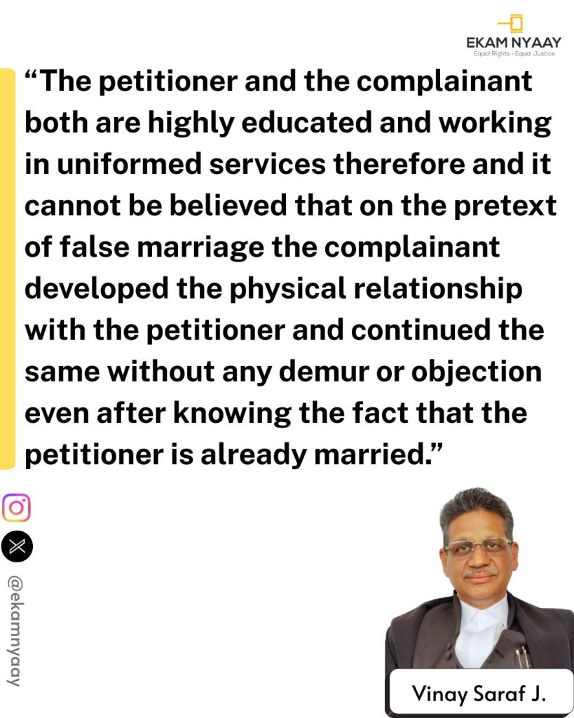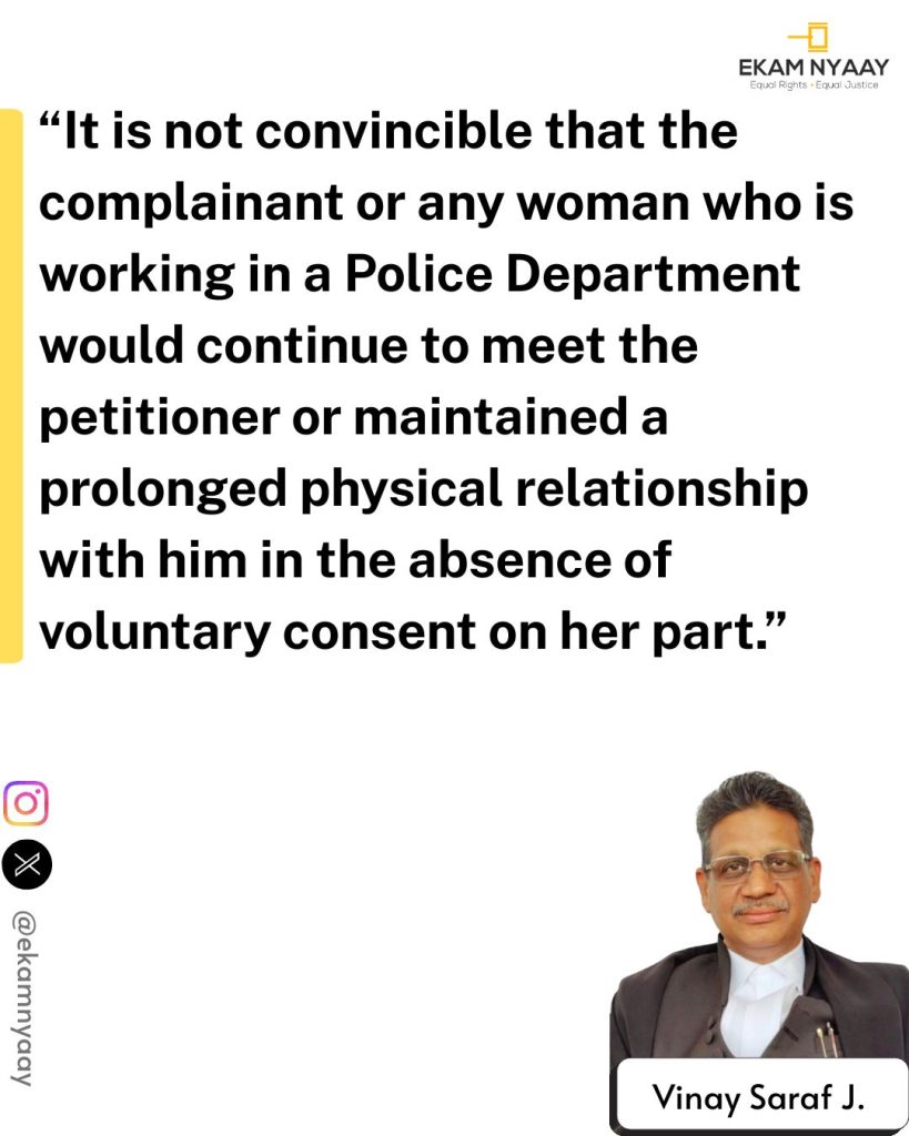 The counsel for the petitioner argued that relationship was consensual between two mature adults. It was submitted that complainant herself was a well-educated woman working as a police constable in Special Police Establishment, Lokayukt Organisation, and had known about petitioner’s marital status since 2013 but still continued the relationship until 2025 without raising any complaint.