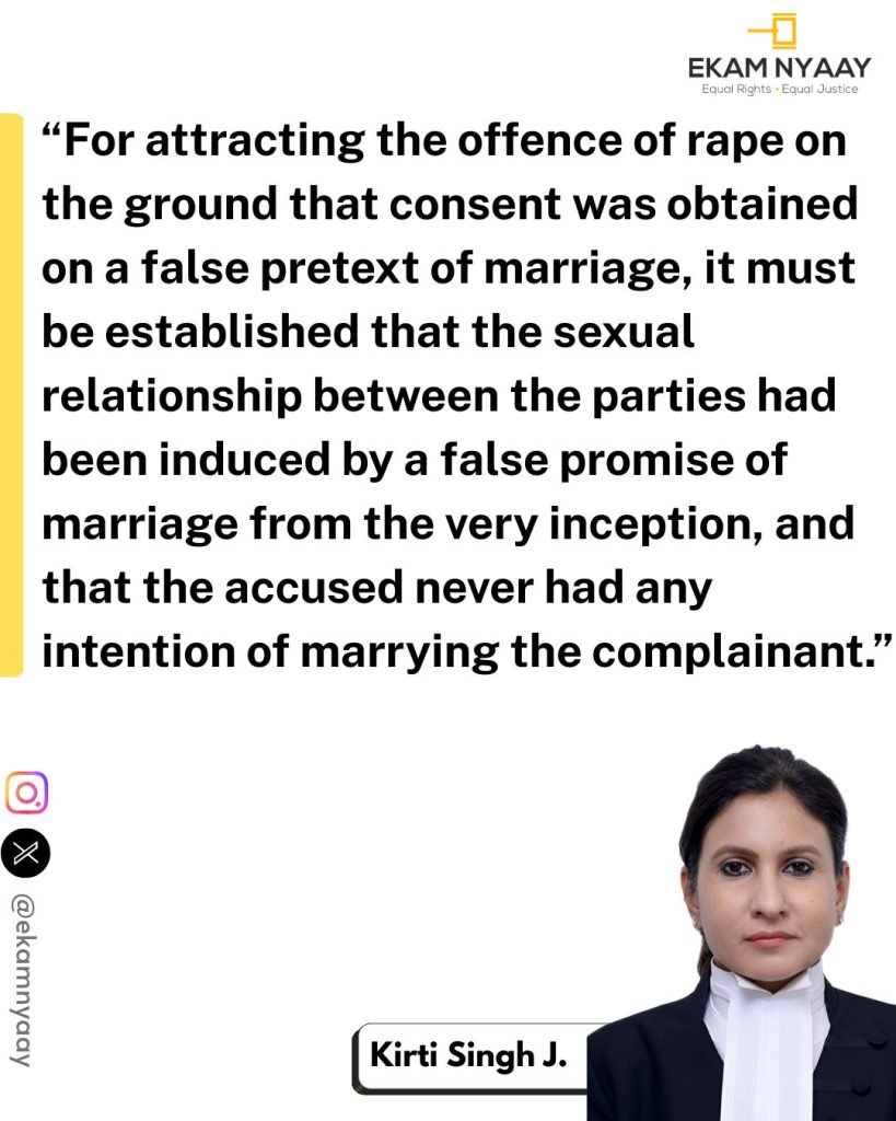 Justice Kirti Singh, while examining the matter, reiterated that for a charge of rape on the ground of false promise to marry, it must be proven that the consent was obtained from the very inception with a fraudulent intention never to marry.