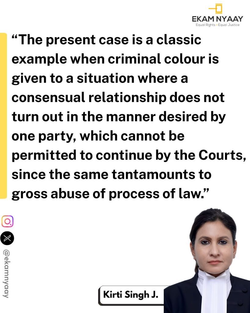 The High Court noted that the admitted position in this case was that the parties were in a long-standing consensual relationship, their families had discussed marriage, and even a roka ceremony was performed. Justice Singh recorded: “It is clear from the judicial record that the relationship between the petitioner and the (complainant), both well educated and mature adults, was consensual from its very inception.”