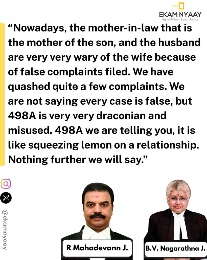 Court noted that while Section 498A IPC (now Section 84 BNS) was enacted to protect women from cruelty and dowry-related harassment, there has been a rising trend of its misuse. It referred to earlier judgments warning against indiscriminate prosecution of husbands’ relatives and stressed the need for courts to exercise circumspection before allowing such prosecutions to proceed.