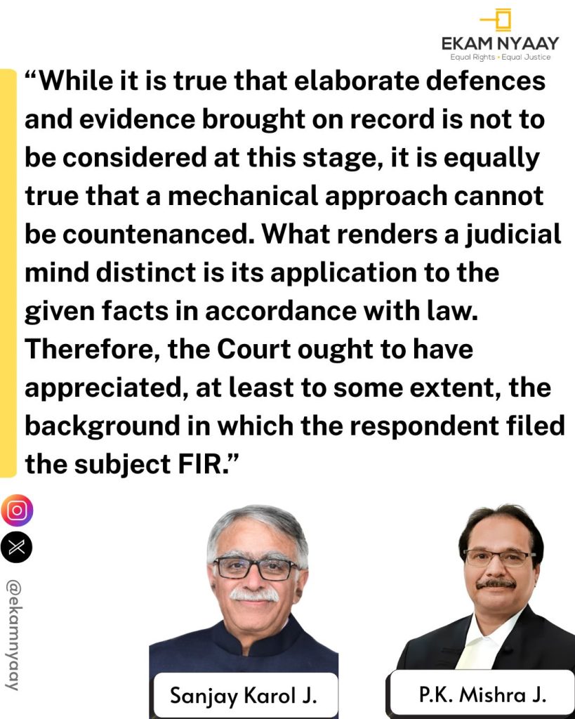 “While it is true that elaborate defences and evidence brought on record is not to be considered at this stage, it is equally true that a mechanical approach cannot be countenanced. What renders a judicial mind distinct is its application to the given facts in accordance with law. Therefore, the Court ought to have appreciated, at least to some extent, the background in which the respondent filed the subject FIR.”, Court observed.